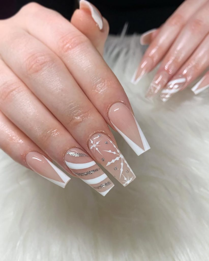 Long, sculpted coffin nails play with negative space: classic white French tip edges, a candy-cane swirl in alternating white and silver, and a clear panel dotted with tiny stars and snowflake lines. The look is crisp, graphic, and surprisingly wearable with winter neutrals.