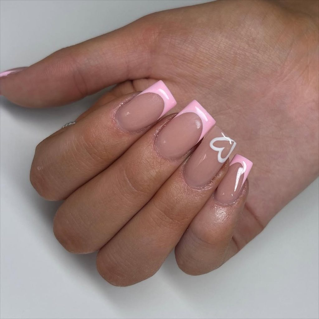 If your winter vibe is “soft glam,” try ballet pink tips on medium square acrylics with one airy heart outline. The palette flatters every skin tone and slides from office hours to date night with zero effort.