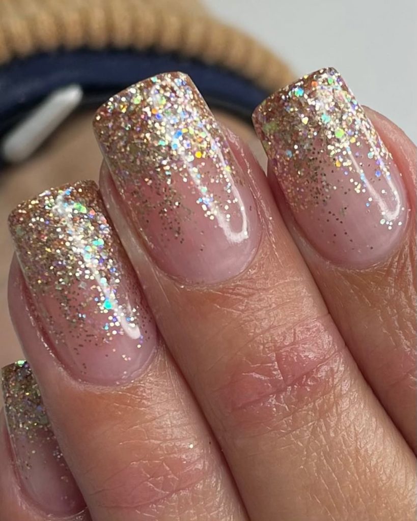 A champagne micro-glitter melt over a sheer base is the manicure equivalent of clinking flutes at midnight. On tidy short squares, the sparkle looks refined, not loud—perfect for office holiday mixers or parent-teacher night.