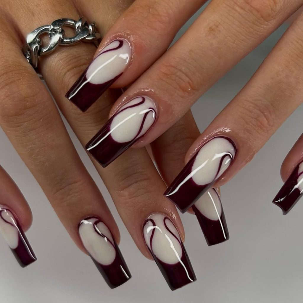 Moody merlot frames creamy negative-space ovals with fluid lines—artful, architectural, and made for a winter capsule wardrobe. The elongated coffin silhouette keeps it editorial while the rich tone channels that luxe, dark season energy.