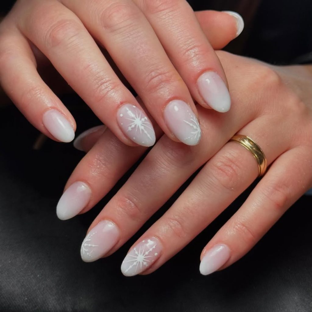 A soft milky fade tips into white, dotted with delicate snowflakes—romantic and undeniably winter. The tapered almond silhouette is flattering on every hand, and shorter lengths stay practical for busy weeks.