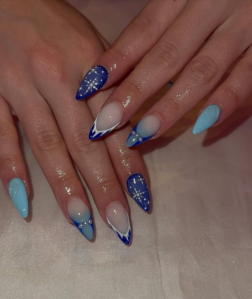 A wintry palette of royal and ice blue plays across tapered almond nails: soft ombré moons, crisp snowflakes, and tiny pearl studs that feel like frosted dew. Negative-space swirls along the cuticle echo a modern French tip without going literal.