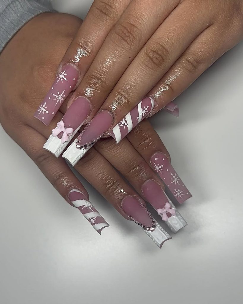 Frosted mauve meets white cable-knit texture, peppermint stripes, snowflakes, and petite bows—like your favorite sweater set, but glam. The elongated coffin silhouette keeps the mix intentional rather than busy, and a subtle crystal swoop adds sparkle without bulk.