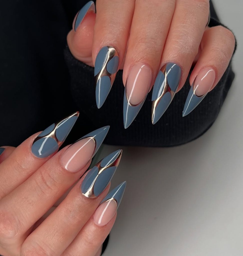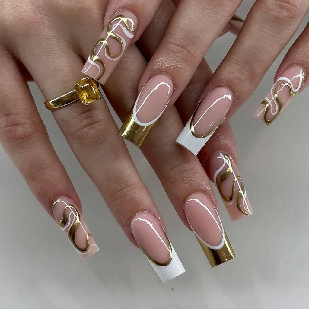 Consider this the “editor’s French”: sculptural blocks of chrome gold and crisp white at the tips, outlined with fine lines that ripple onto accent nails. The long coffin shape gives the architectural edges room to shine while keeping the base clean and sheer.