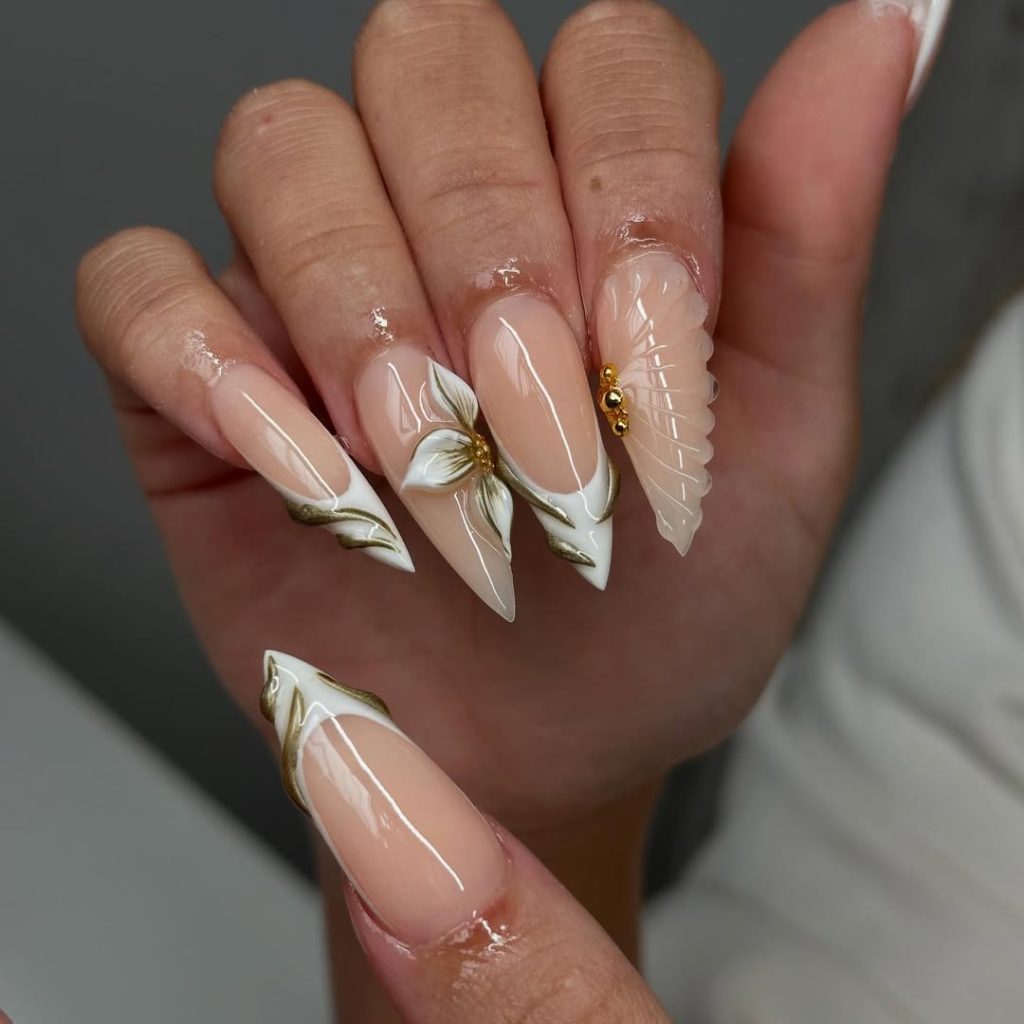 Old-Hollywood glamour meets modern sculpting: crisp white micro French tip edges trimmed in antique gold, a hand-modeled blossom that looks poured from porcelain, and one carved leaf with tiny studs at the cuticle. The tapered almond/almond shape keeps everything elegant rather than over-the-top—like pairing a silk slip with a tuxedo coat.