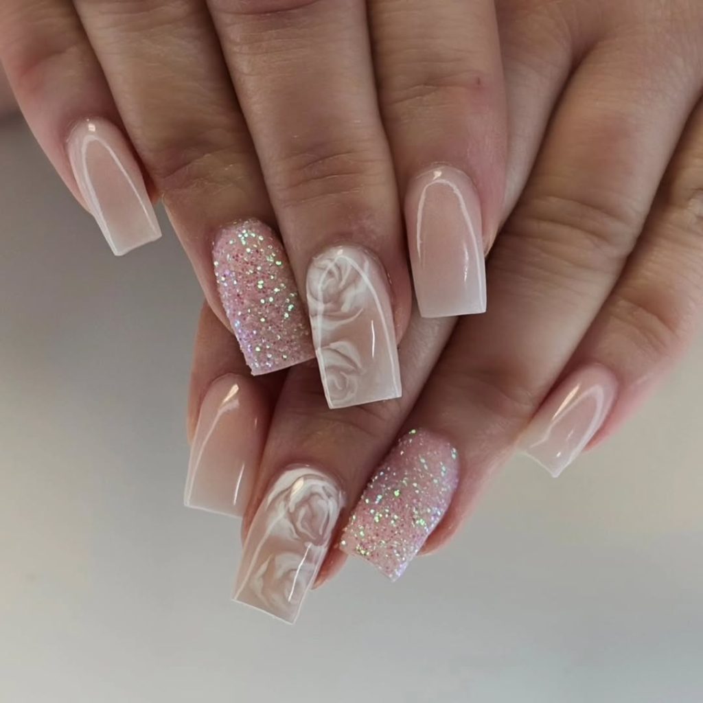 Think of this set as the office-to-after-hours chameleon: a sheer pink base with chunky iridescent confetti packed near the tips. It’s playful without reading overdone, especially on medium square acrylics.