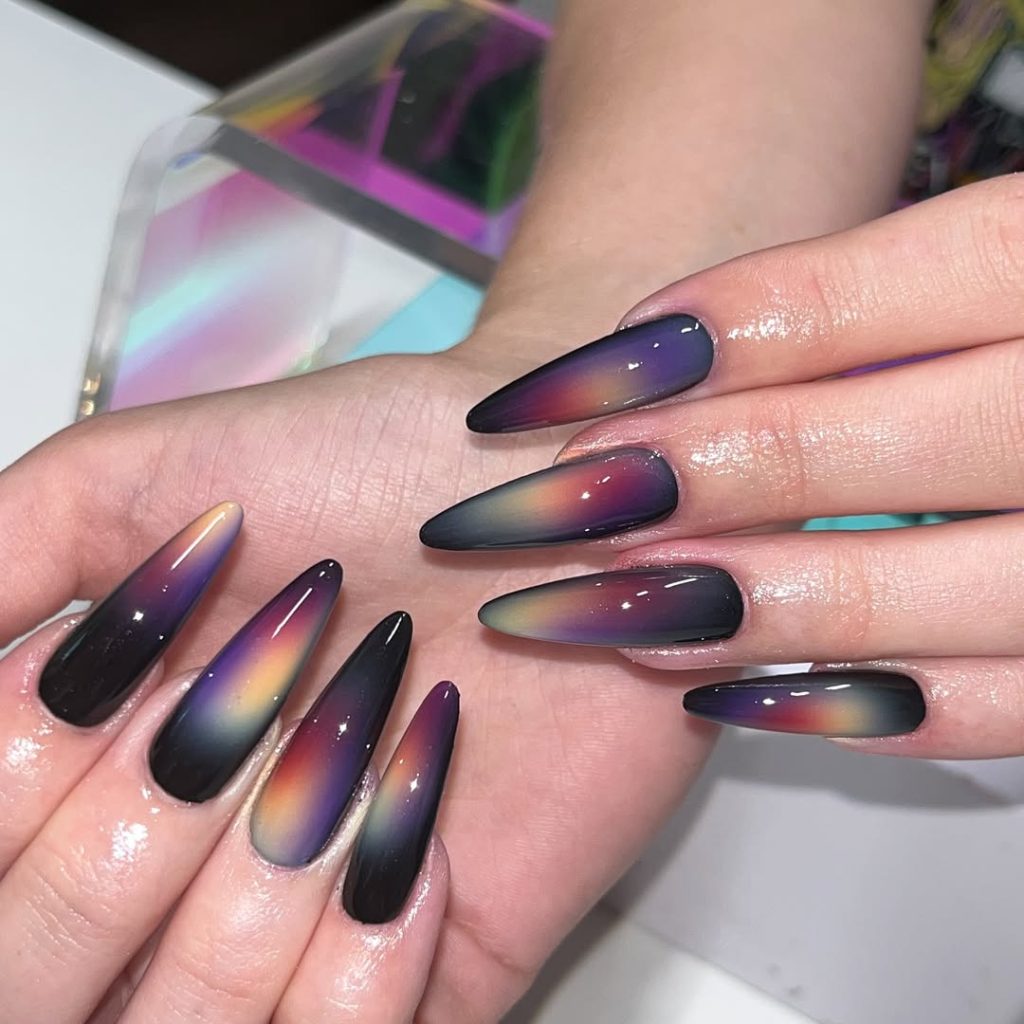 A moody, dark gradient that melts from obsidian into aurora hues—plum, ember, and deep teal—glossed to a mirror shine. The elongated almond silhouette makes the ombré feel like a winter horizon at 5 p.m., equal parts dramatic and wearable.