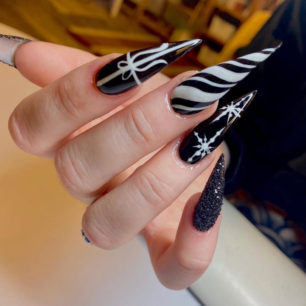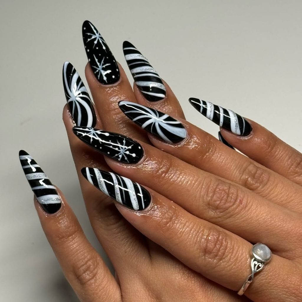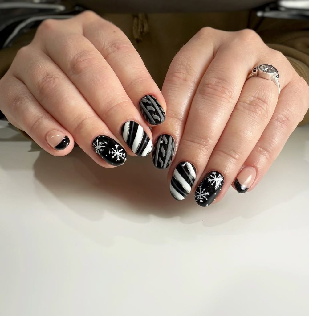Oval noir nails alternate between glossy-matte cable-knit embossing and diagonal candy stripes in black-and- White and . Two nails carry delicate snowbursts, keeping the palette wintry but refined—proof that texture can do as much heavy lifting as color. It’s wearable Art that makes a cream sweater and wool coat feel instantly styled.