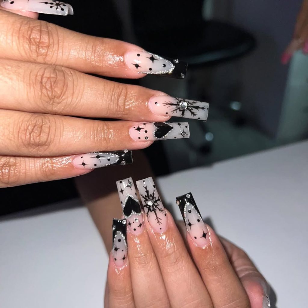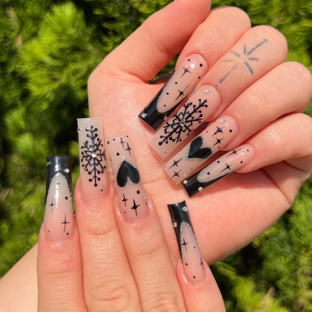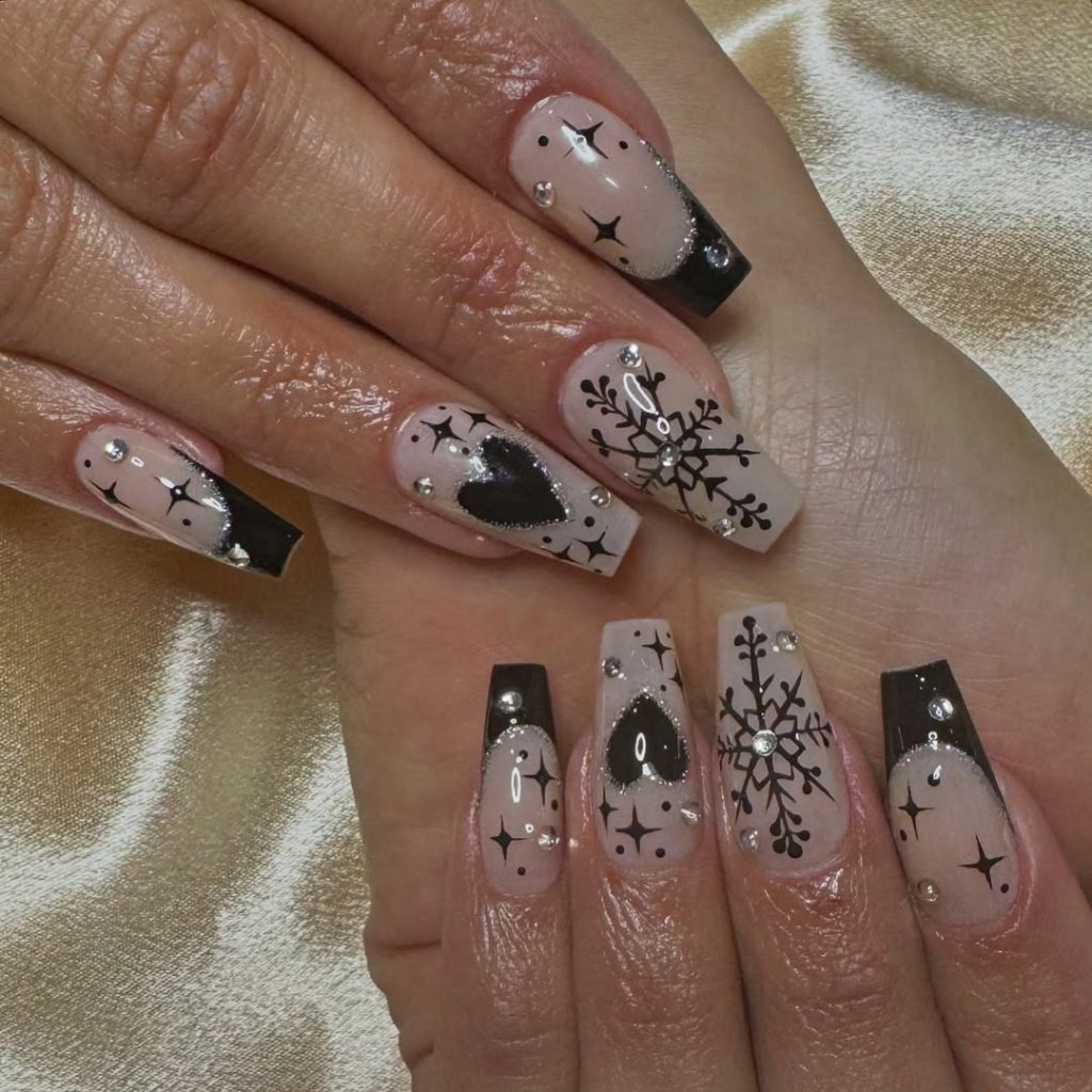 A sheer nude base sets the scene for black micro-stars, rhinestone pinpoints, and sculpted hearts. The reverse cut-out French tip in inky black elongates these long square nails while snowflake emblems cue holiday magic. The result is playful yet grown-up—equal parts gallery girl and gala guest.