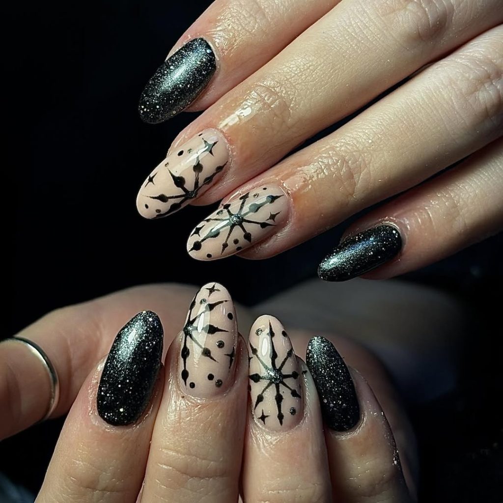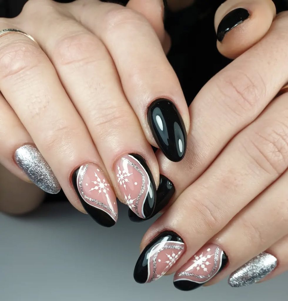 Curvy obsidian tips trace a wave across a blush base, bordered by micro-glitter piping and delicate snowflakes. A mirrored Silver and accent nail breaks up the rhythm, while the softly rounded almond shape keeps everything wearable for weekdays.