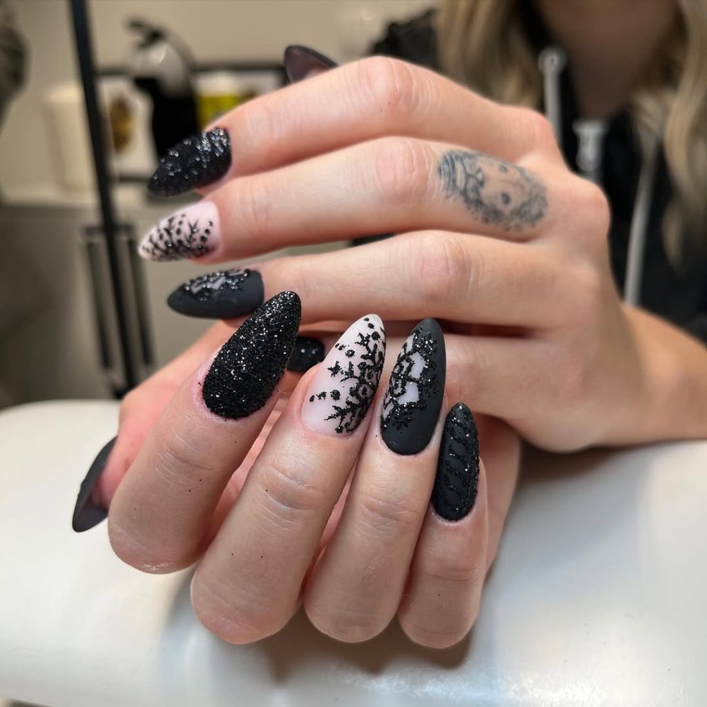 A moody study in texture: plush matte black alternates with sugar-coat glitter and lace-like appliqué. The elongated almond silhouette softens the drama, while the tonal palette feels couture—like your favorite little-black-dress translated to nails.