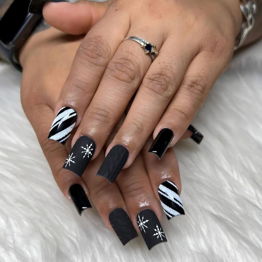 Short-to-medium square tips play with finish: jet-black gloss, cashmere-matte, and icy zebra striping in sparkling white. Hand-painted snowflakes bring Winter charm without skewing sweet, so the look feels fashion-forward for city errands and late-night fêtes alike.