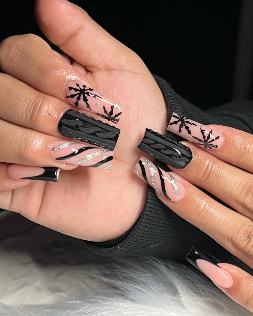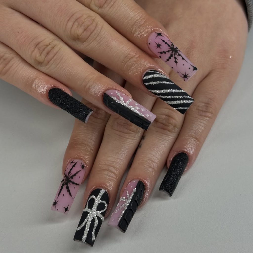 A modern French goes noir: deep black tip blocks punctuated by comet-like snowbursts, while neighboring nails add zebra-glitter diagonals and matte branches. The elongated square silhouette gives instant elegance; the Silver and ribbons keep it celebratory.