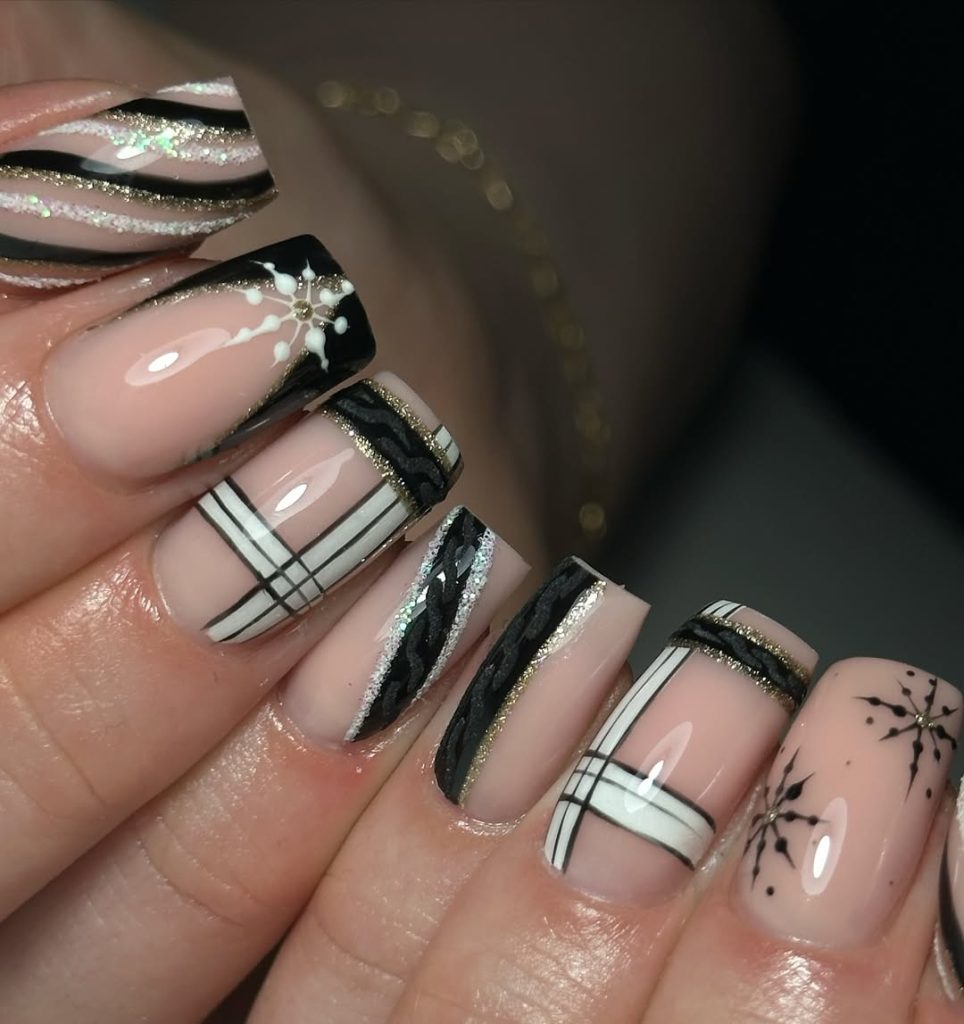 A polished nude base becomes a holiday canvas for onyx-and-ivory plaid, slim bands of micro-glitter, and a single snowflake tipped with champagne studs. Alternating nails add raised black texture and diagonal shimmer, creating that “party blazer” effect in manicure form. Think sophisticated Designs that nod to gift-wrap without going literal—very “fashion desk at Allure” energy.
