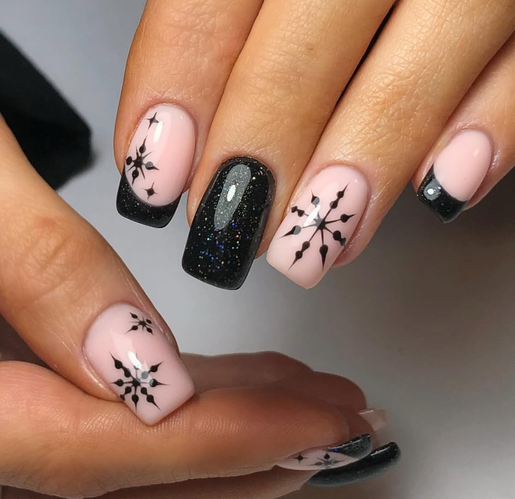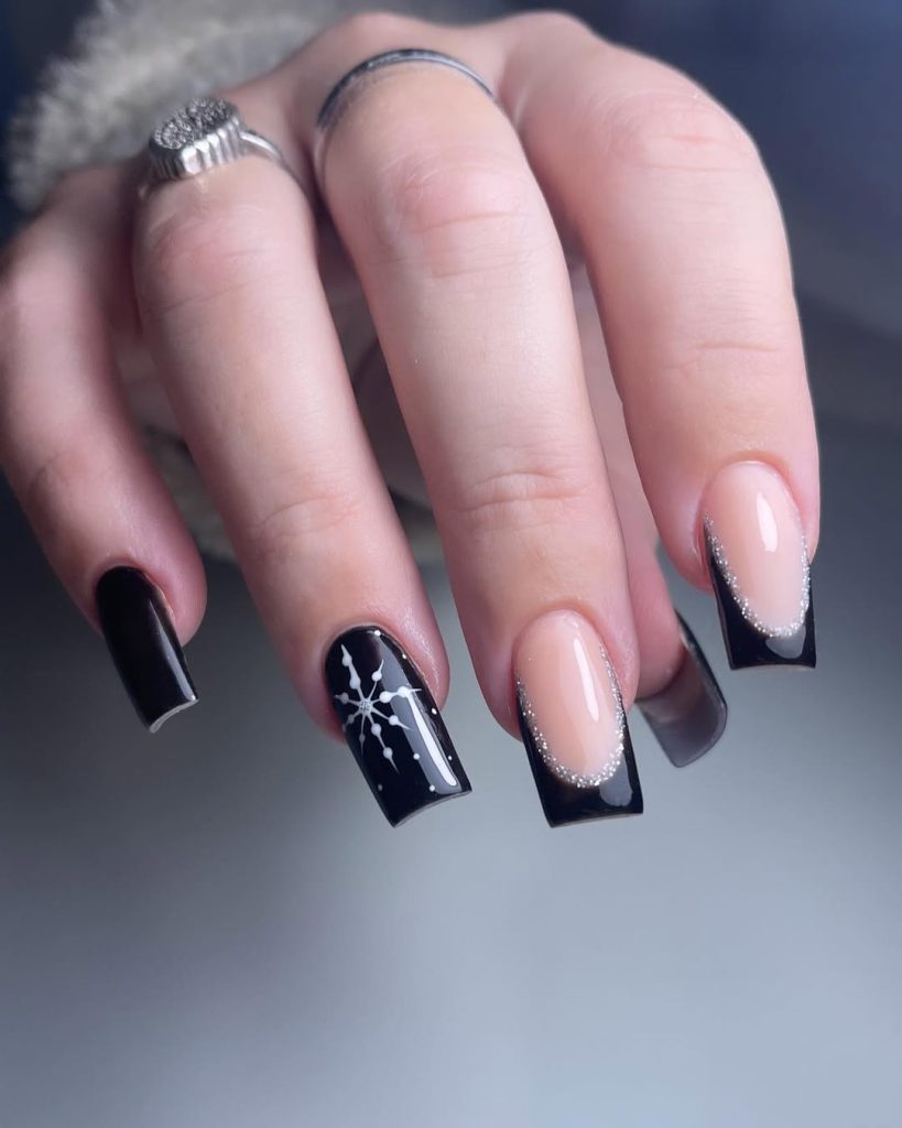 A sharp square French in glossy black meets a frosted halo of micro-beads plus one statement nail with a white snowburst. Clean, graphic, and endlessly wearable—call it quiet-luxury holiday nails.