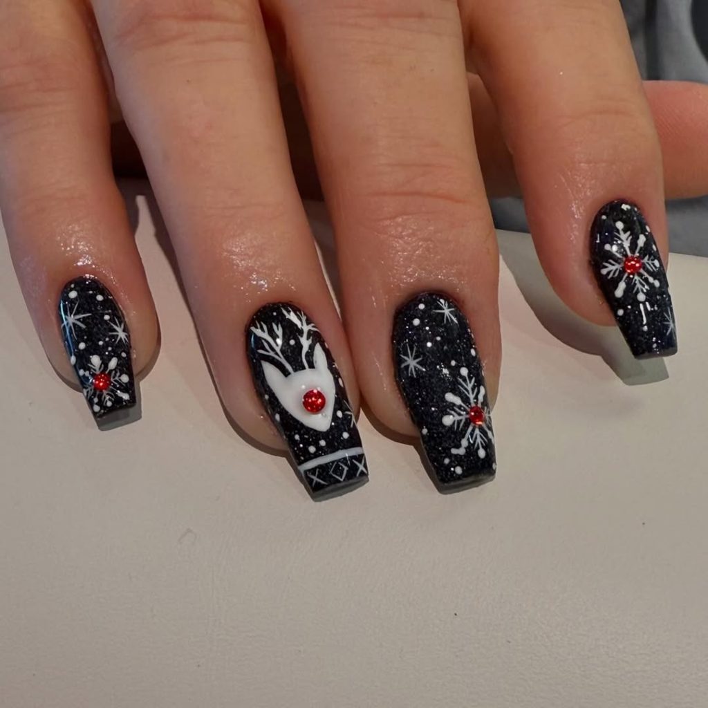A sparkling coal backdrop sets the scene for high-contrast snowflakes and a sculpted reindeer silhouette, each accented with a tiny red gem—cheeky Red and detail, editor-approved. The shape lands between tapered square and slim coffin, a flattering choice for those who want elongation without extreme length.