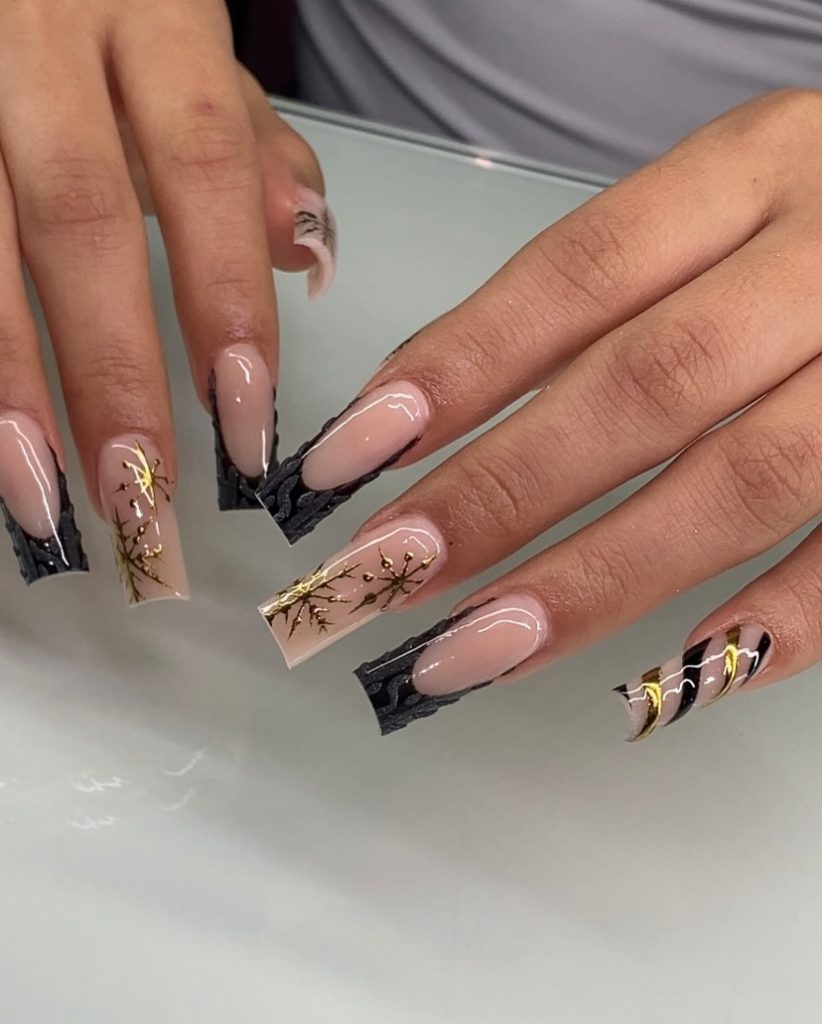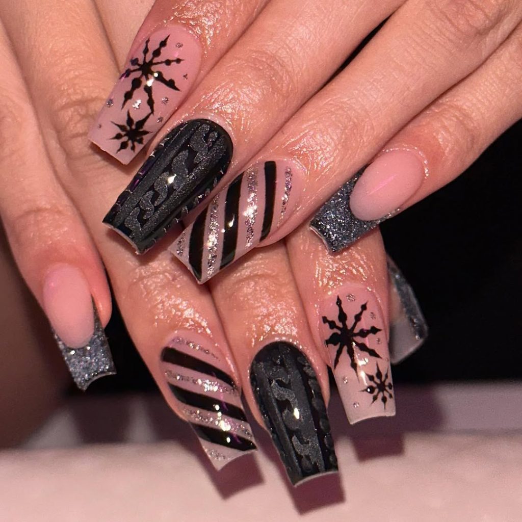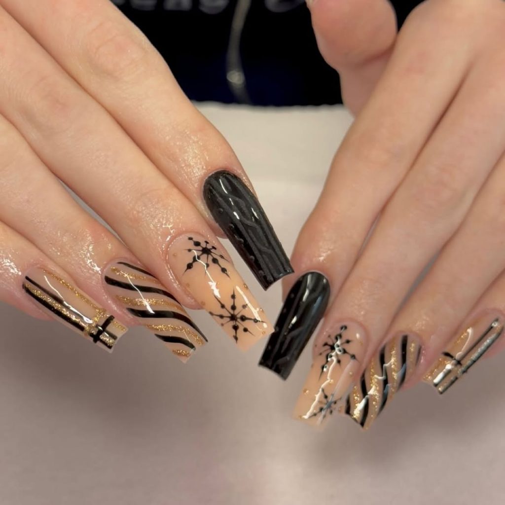 A blush base meets glossy black moiré tips and metallic snowflakes brushed in Gold and . A single striped accent softens the graphic blocks and ties the palette together. Think champagne-bar elegance on long, straight coffin tips—festive without a single piece of glitter fallout.