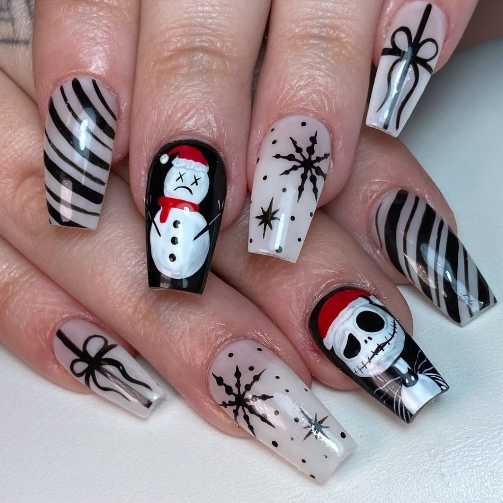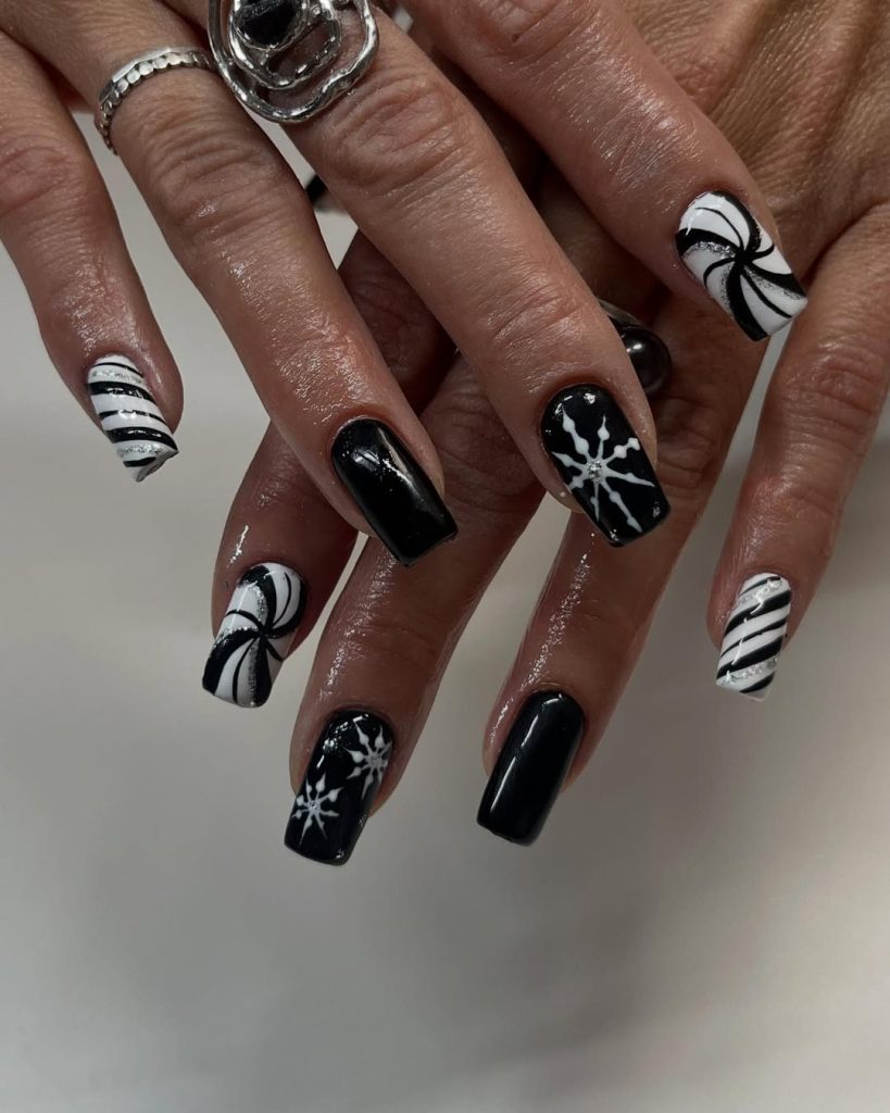 Short, practical nails go high-impact with black-and- White and pinwheels, glittered candy-cane stripes, and crisp snowbursts. The mixed placement makes everyday gestures—typing, texting—look editorial. This is my go-to recommendation for clients who want Designs holidays energy without committing to length.