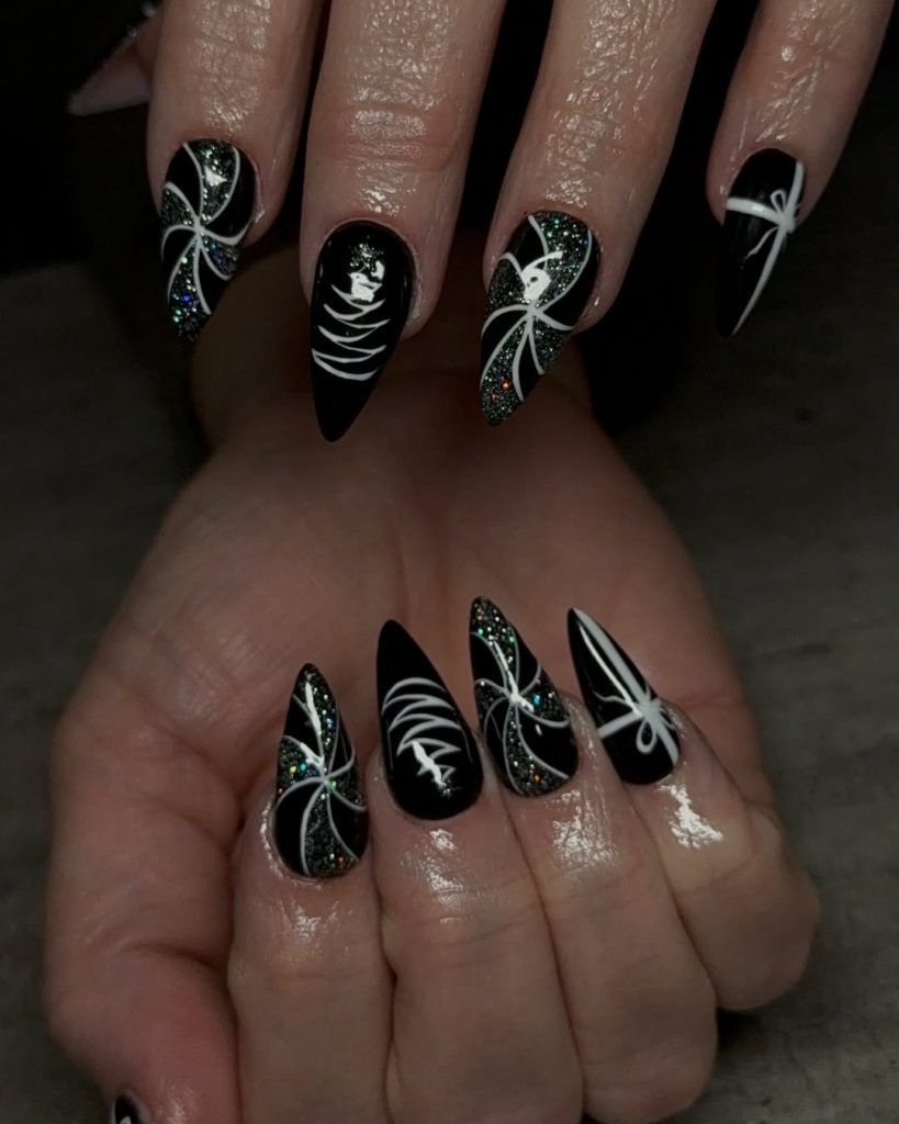 Gloss-black points swirl with white pinwheels, comet lines, and tiny snow-speckle details. The elongated almond silhouette reads couture but surprisingly practical—the pattern elongates fingers and looks chic with both denim and satin.