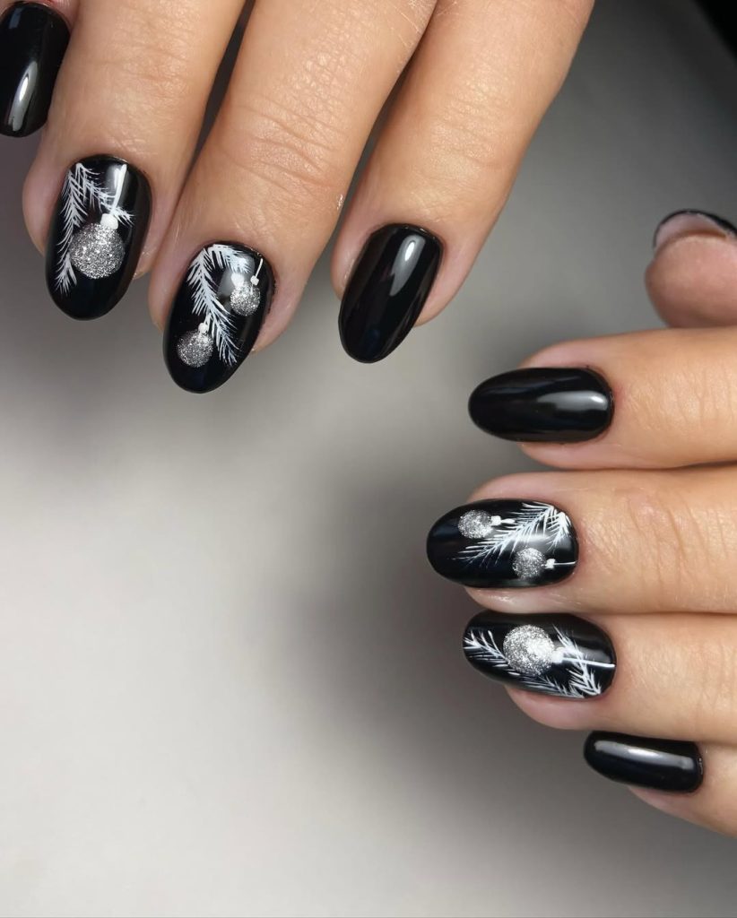 High-gloss ovals in inky black are brushed with fine white fir needles and dusted with foiled ornament “baubles.” The look is pared-back and wearable, ideal for Short lengths or two-week maintenance windows—true Winter short practicality without sacrificing chic.
