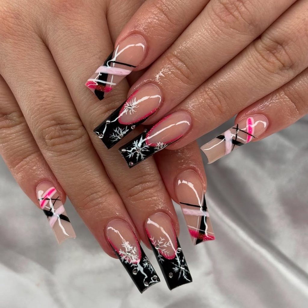 A bold remix of the black French: crisp noir tips, snowflakes, and crossing ribbons in blush-to-neon Pink and . Strategic rhinestones catch the light while the straight-edge square shape keeps the design graphic and grown-up. Consider this your showstopper set for a girls’ night or NYE.