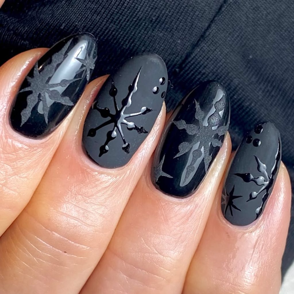 Matte-black ovals with glossy, embossed snowflakes prove that minimal can still be dramatic. The raised shine catches candlelight, while the soft-touch finish keeps the look refined for gallery openings and late dinners. It’s the chicest study in negative space and texture—pure Inspo for Winter evenings when you want polish to behave like jewelry.