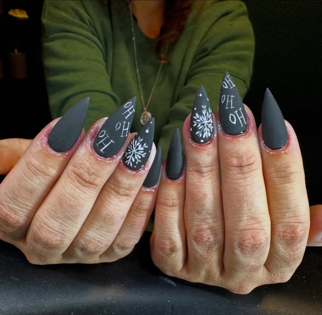 Matte charcoal points get a typographic wink—white “HO HO HO” script and crisp snowflakes. The finish feels velvet, the message playful but polished. If your style leans minimalist with a twist, this set threads the needle between classic Winter and downtown cool.
