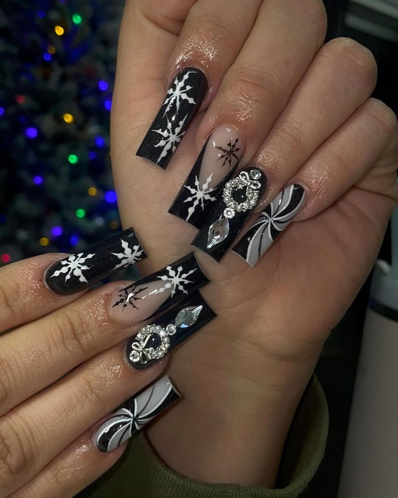 Elongated square tips in a sheer blush base are finished with inky noir blocks, crystal arcs, and jet-black hearts. Snowflake wheels add holiday sparkle without feeling kitschy, so the set works from office to champagne bar. If your December calendar is stacked, this is the “one-and-done” manicure that carries every outfit.
