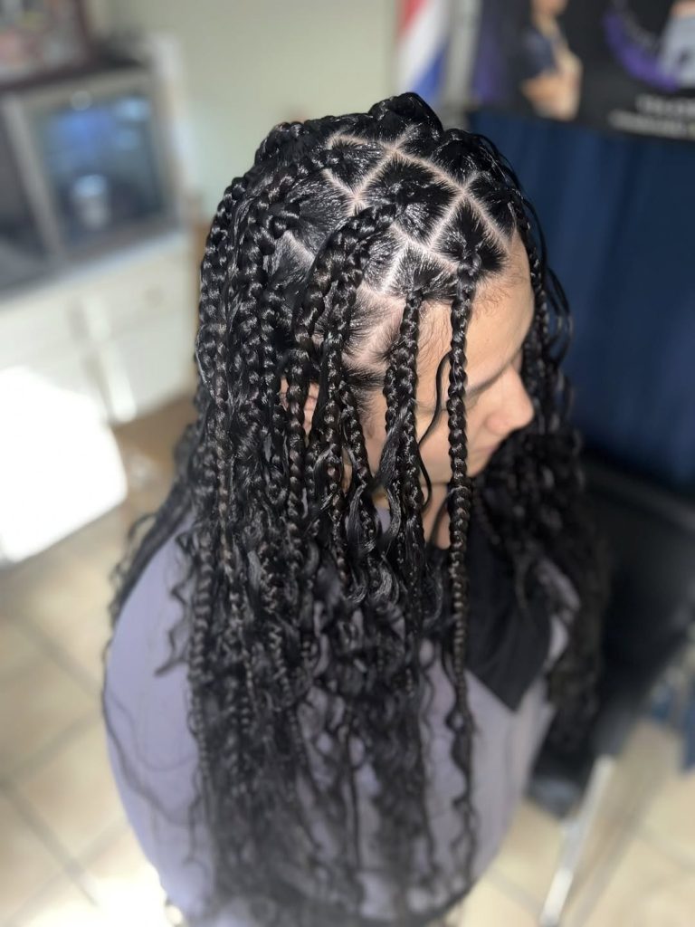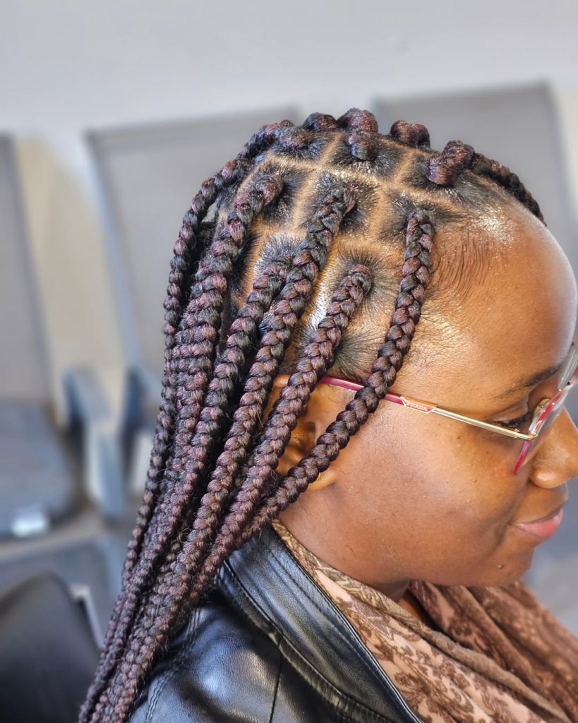 This style blends classic box braids with subtle cornrows and sectioned structure at the scalp. The result is a hairstyle that feels architectural yet wearable. Each braid is placed with intention, creating visual interest while maintaining balance across the head.
