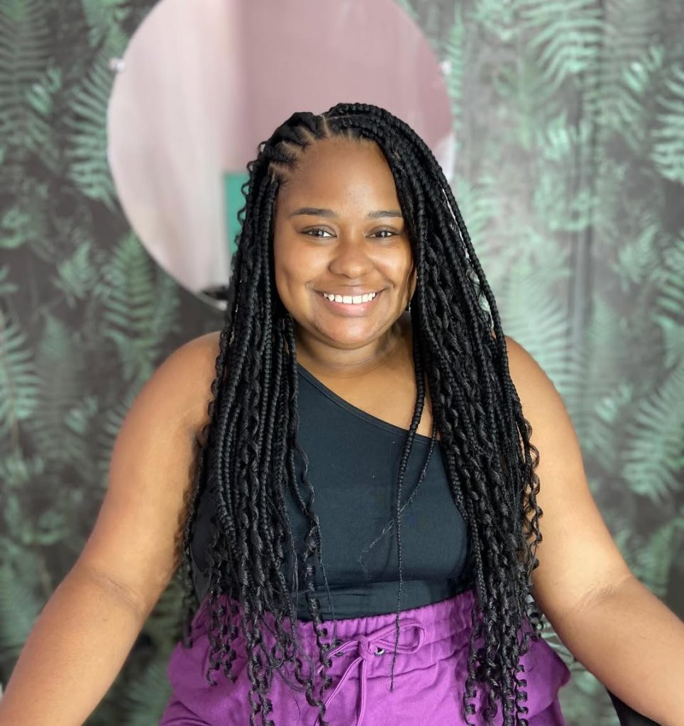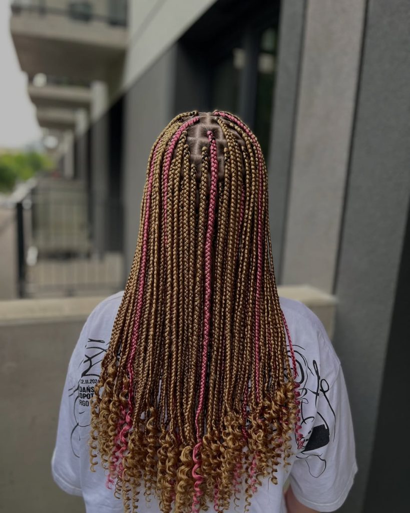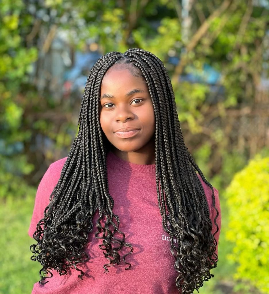This style highlights long box braids finished with natural-looking curls, a popular option for kids and teens but increasingly worn by adults who love a softer aesthetic. The braids fall smoothly before transitioning into loose ends, giving the hairstyle lightness and playfulness.