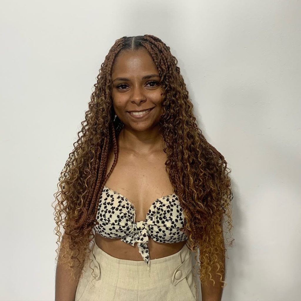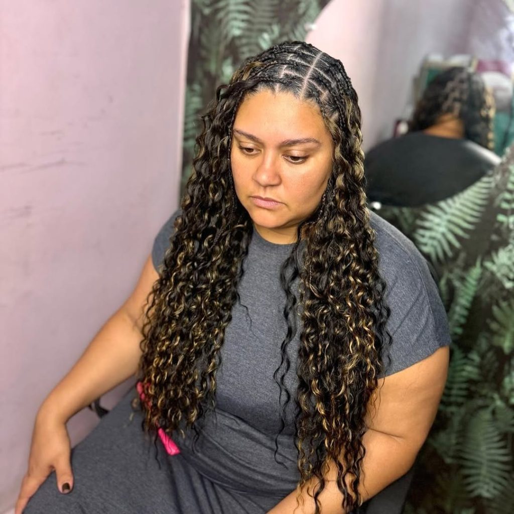 These with curls finishes soften the overall appearance and pair beautifully with casual or romantic outfits. Stylists often suggest this approach for women transitioning from curly natural styles into braids, as it keeps a familiar texture in the look while protecting the hair underneath.