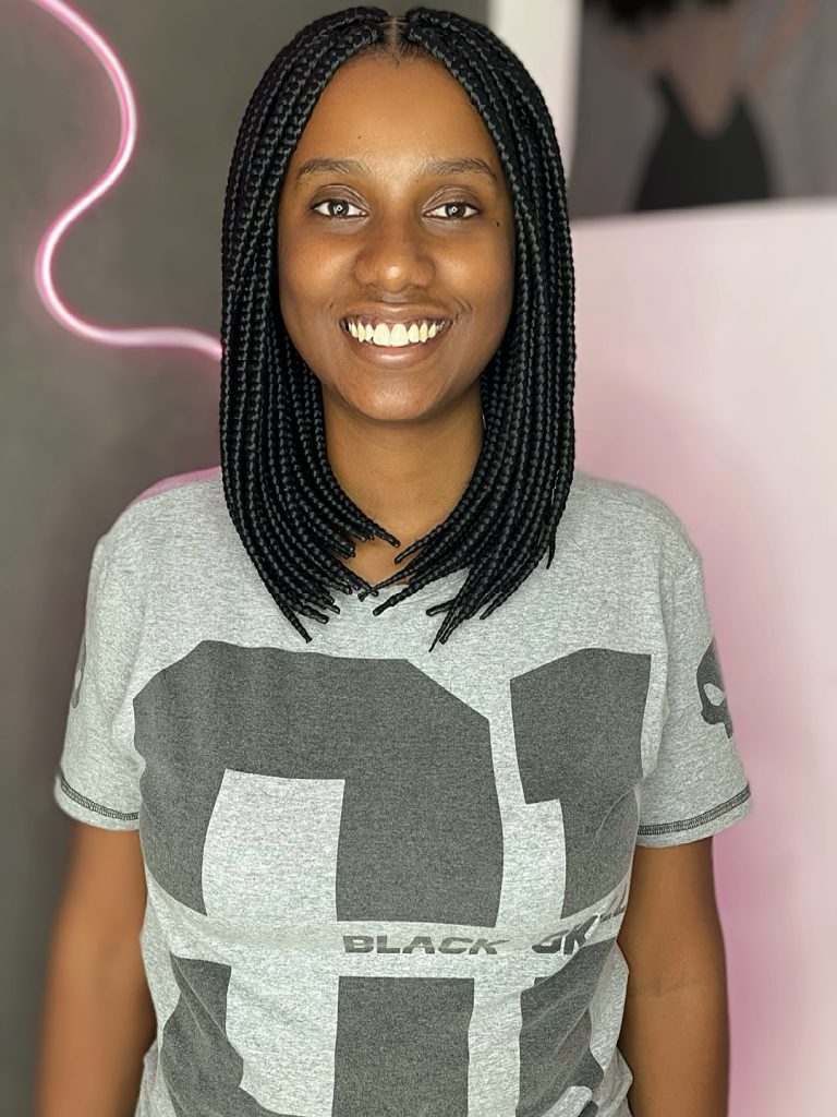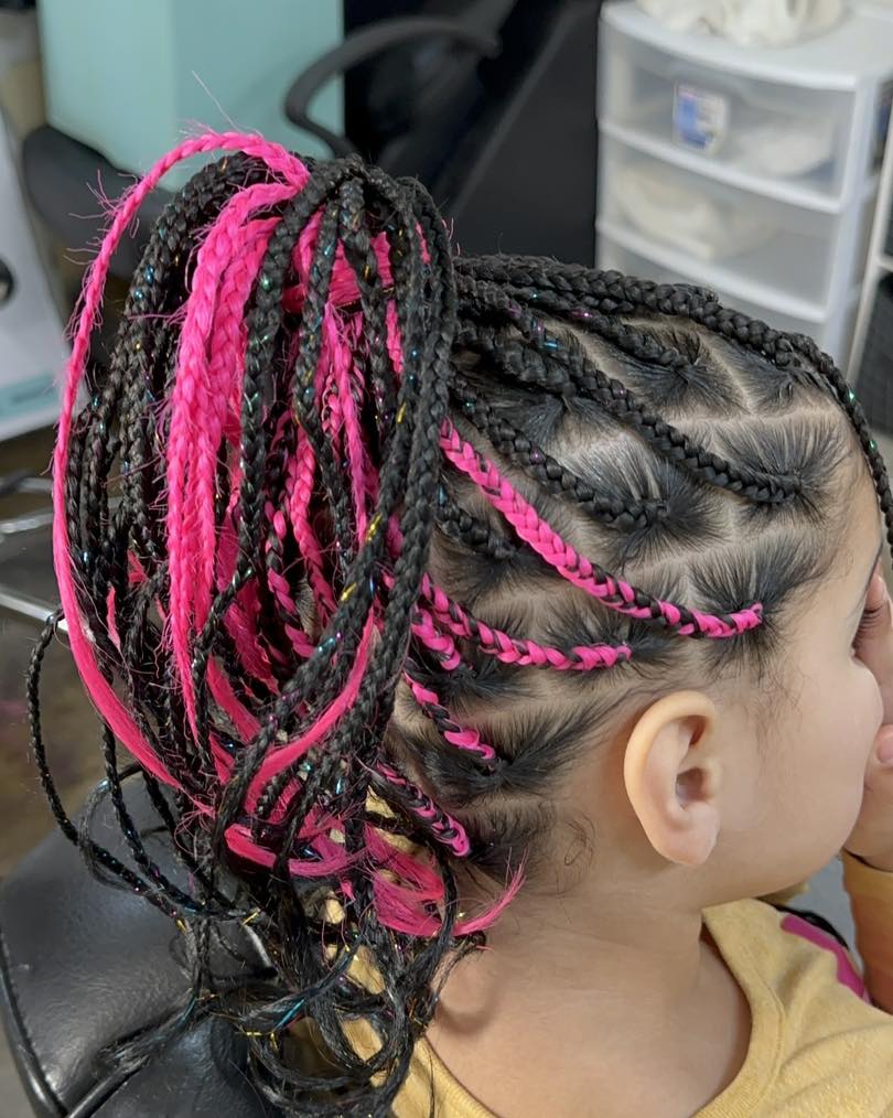This short box braid style stands out through strategic color placement and compact length. The braids are styled upward and back, creating structure while keeping the look lightweight. It’s a playful yet practical option that works beautifully for kids as well as adults who prefer cropped protective styles.