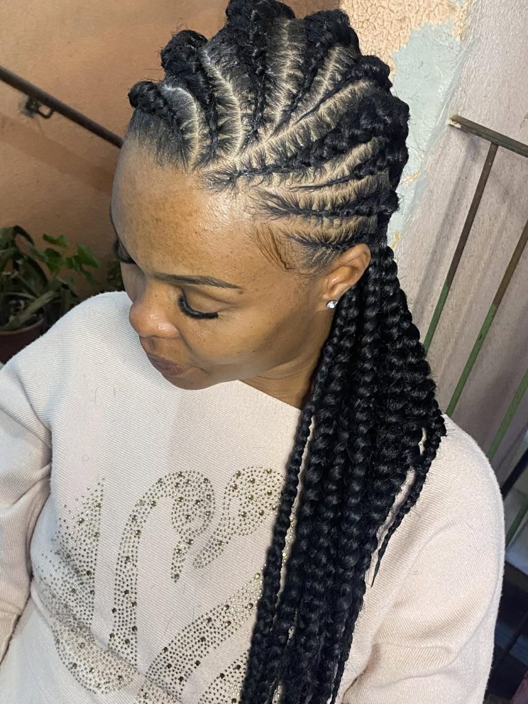 This look leans into cornrows and box braids combined, with curved, sculpted parting that draws attention to the scalp design. Each braid follows a deliberate pattern, creating a sense of rhythm and symmetry across the head.