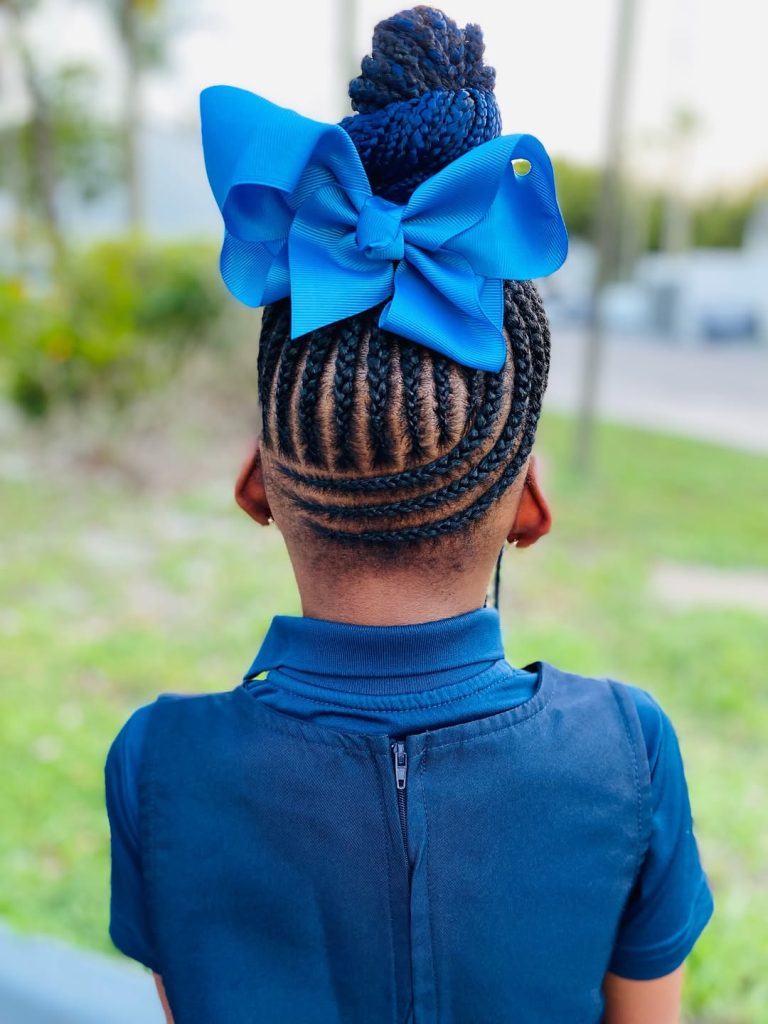 This style showcases a clean, sculpted braided bun positioned high on the crown, finished with a bold bow that instantly elevates the look. The precise sectioning at the nape highlights cornrows feeding seamlessly into the bun, making this an excellent example of kid- and adult-friendly styling that feels both playful and refined. While often seen in school settings, this silhouette also works beautifully for women who want a neat, pulled-together option that lasts all day. In 2026, this kind of braid-to-bun structure is especially popular for women seeking formal styles that don’t sacrifice personality.
