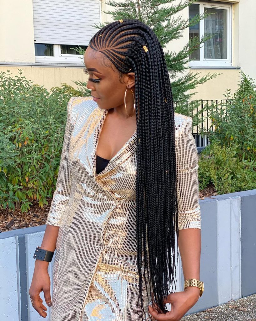 Side-directed feed-ins glide into waist-skimming knotless braids—a sleek-meets-flowing combination that moves beautifully with each step. Minimal hardware (think a few gold cuffs) keeps the look luxe rather than busy.