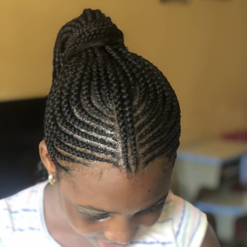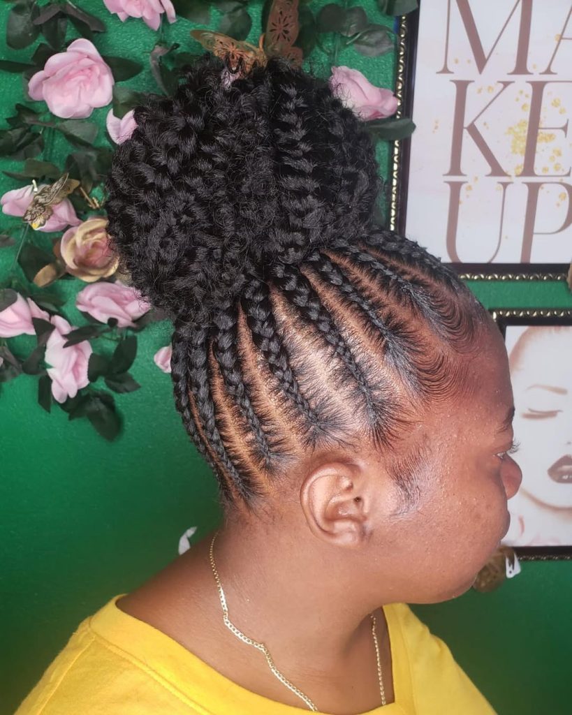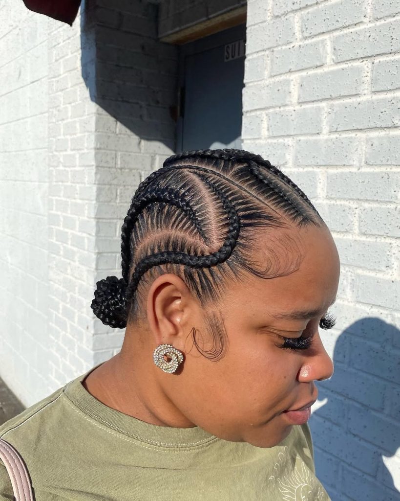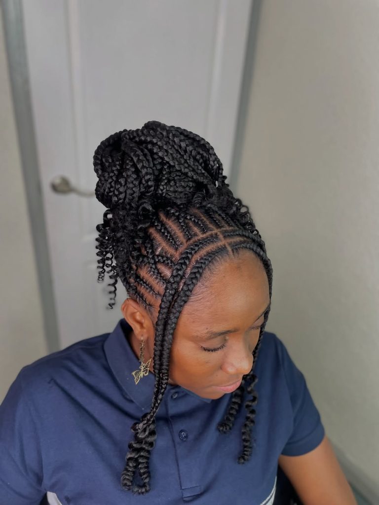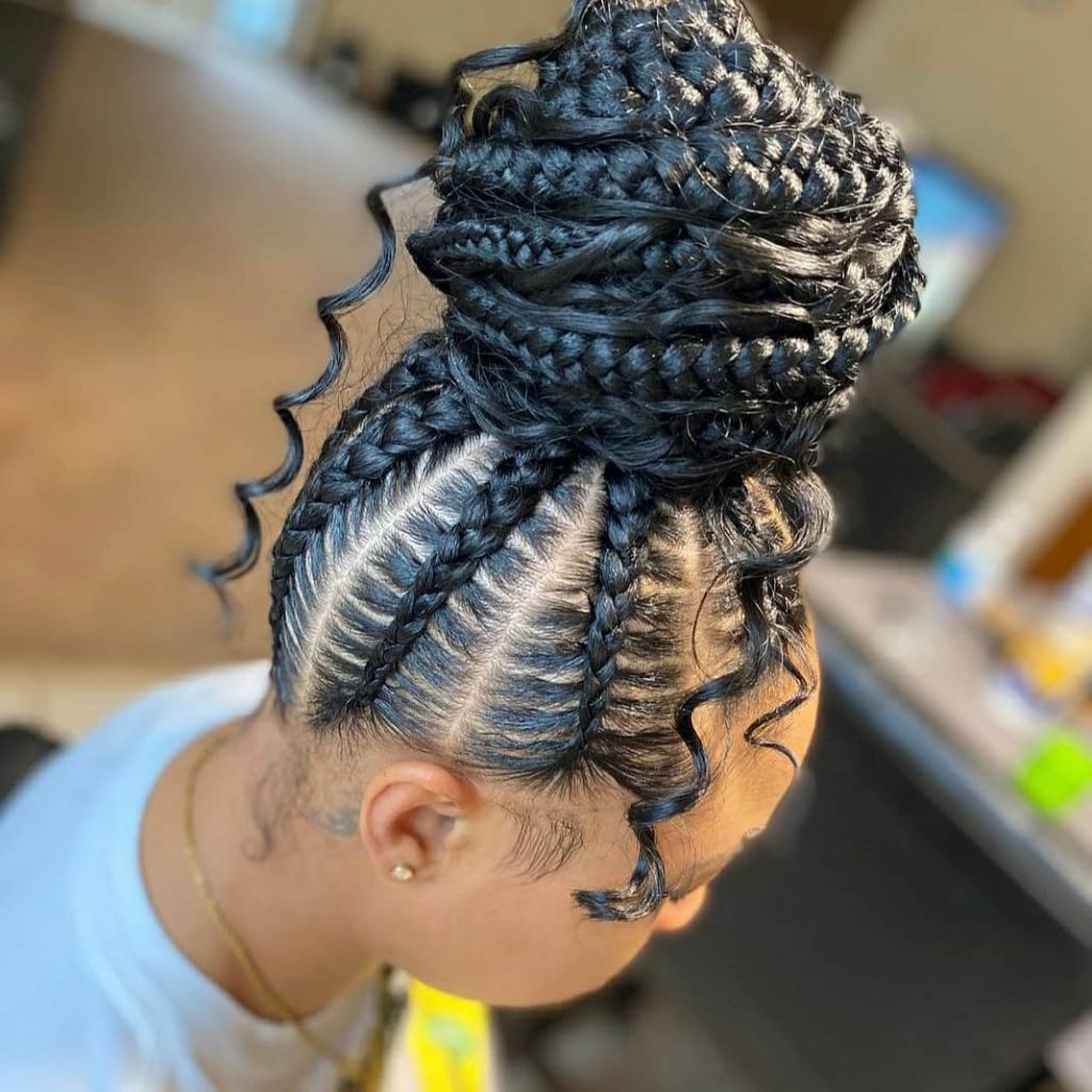 This sculpted pattern of feed-in cornrows sweeps upward into a petite top bun, then cascades into soft, wand-like tendrils. It’s an updo that splits the difference between polished and playful. Ask your braider for fine, closely spaced parts that curve naturally toward the crown; the curvature lifts the face and spotlights cheekbones (celebrity stylist Kim Kimble uses the same trick on red carpets).