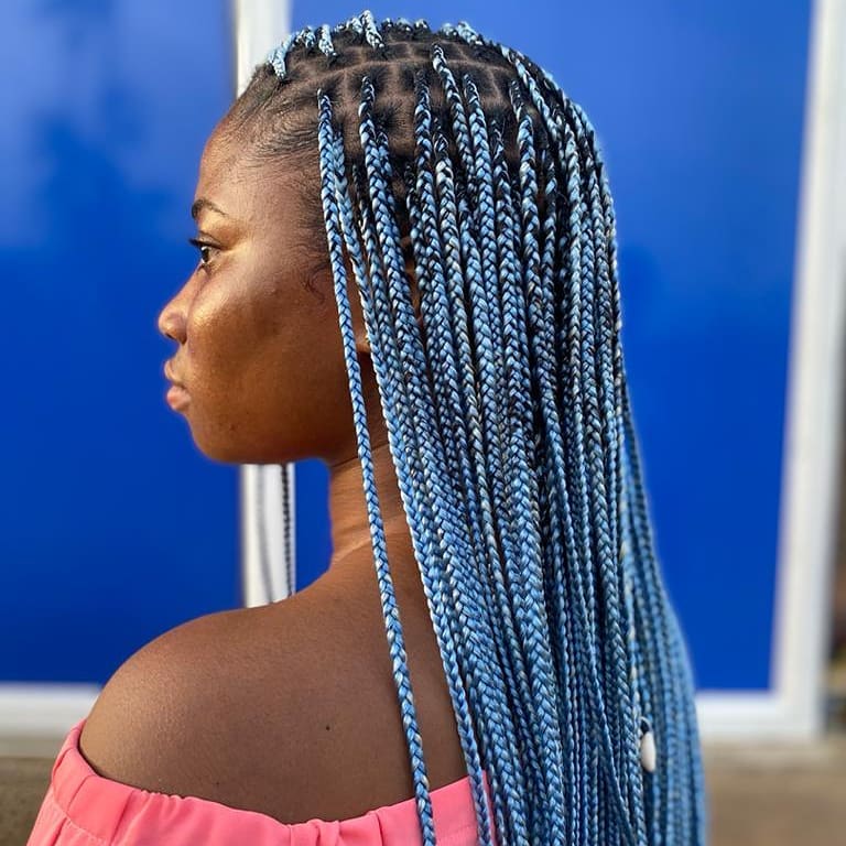 A cool-toned, denim-to-sky-blue ombré turns classic knotless braids into pure dopamine dressing. The two-tone blend is workplace-friendly yet undeniably fashion-forward.