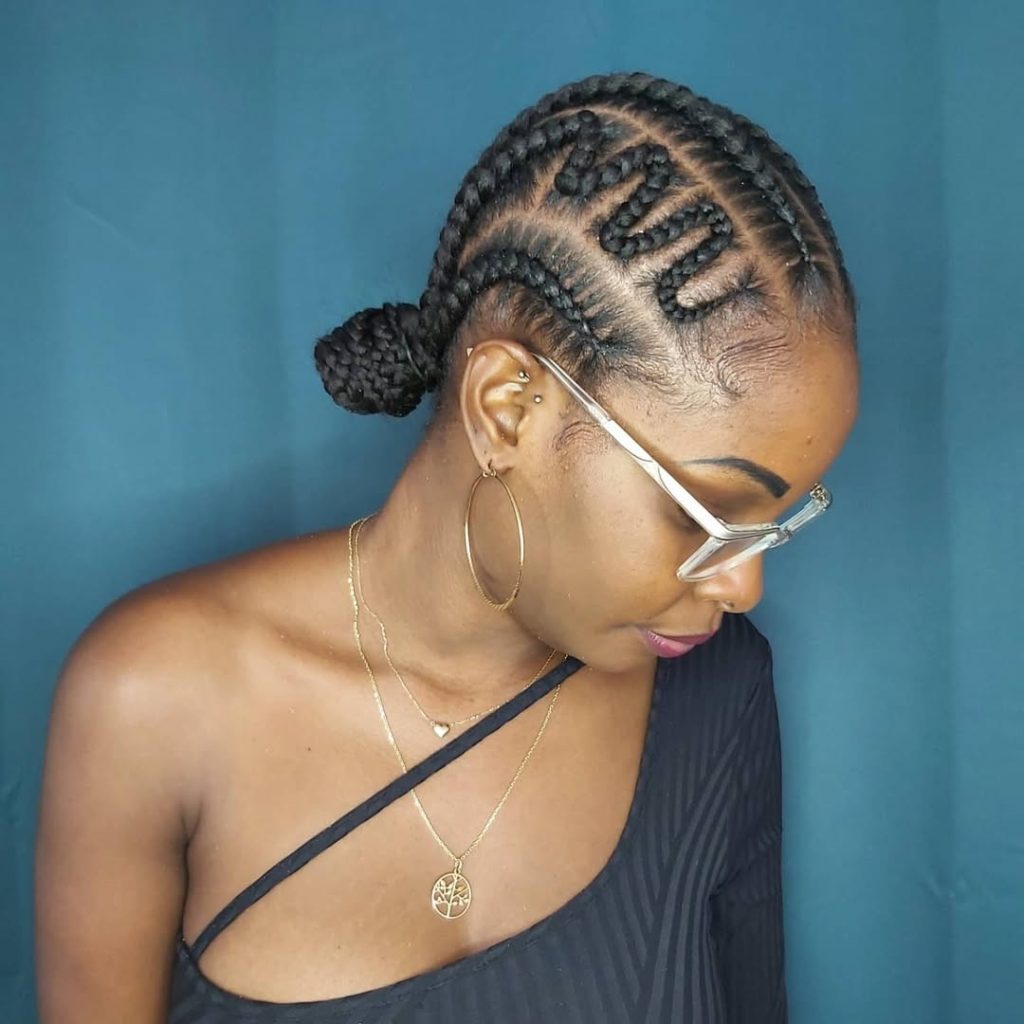 Graphic Side-Swirl Cornrows into Low Nape Bun