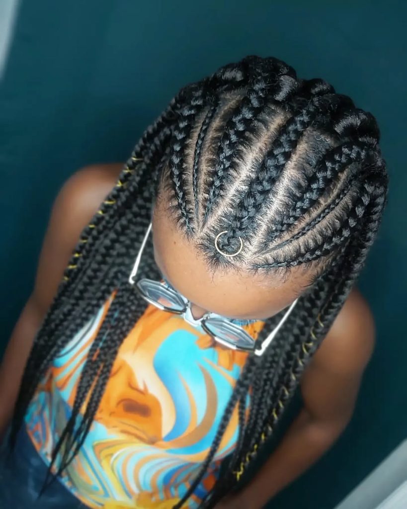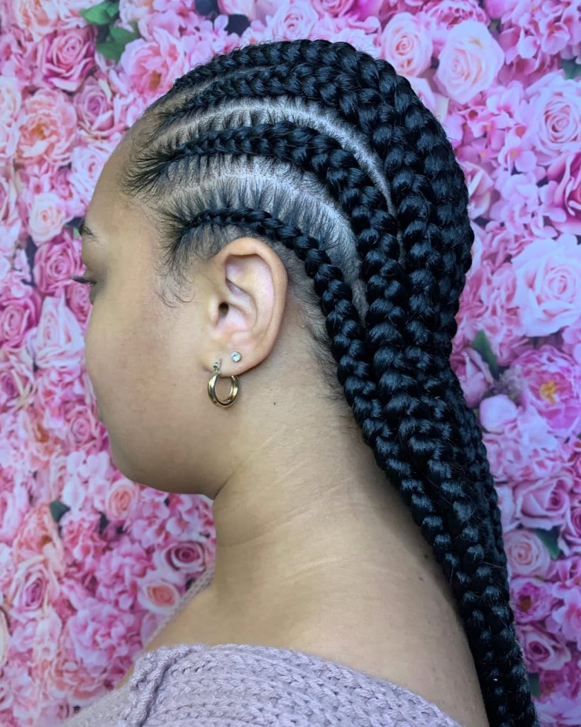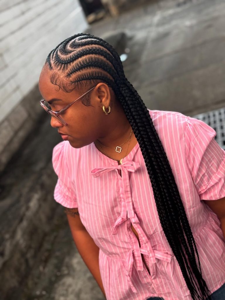 Four oversized straight-back cornrows feed into tail braids for a minimalist, strong silhouette. This is the “no-fuss” protective style stylists recommend for gym streaks and busy travel weeks. Why it works: Fewer braids = faster install and even faster takedown. The pattern is scalp-breathing and a breeze to oil.