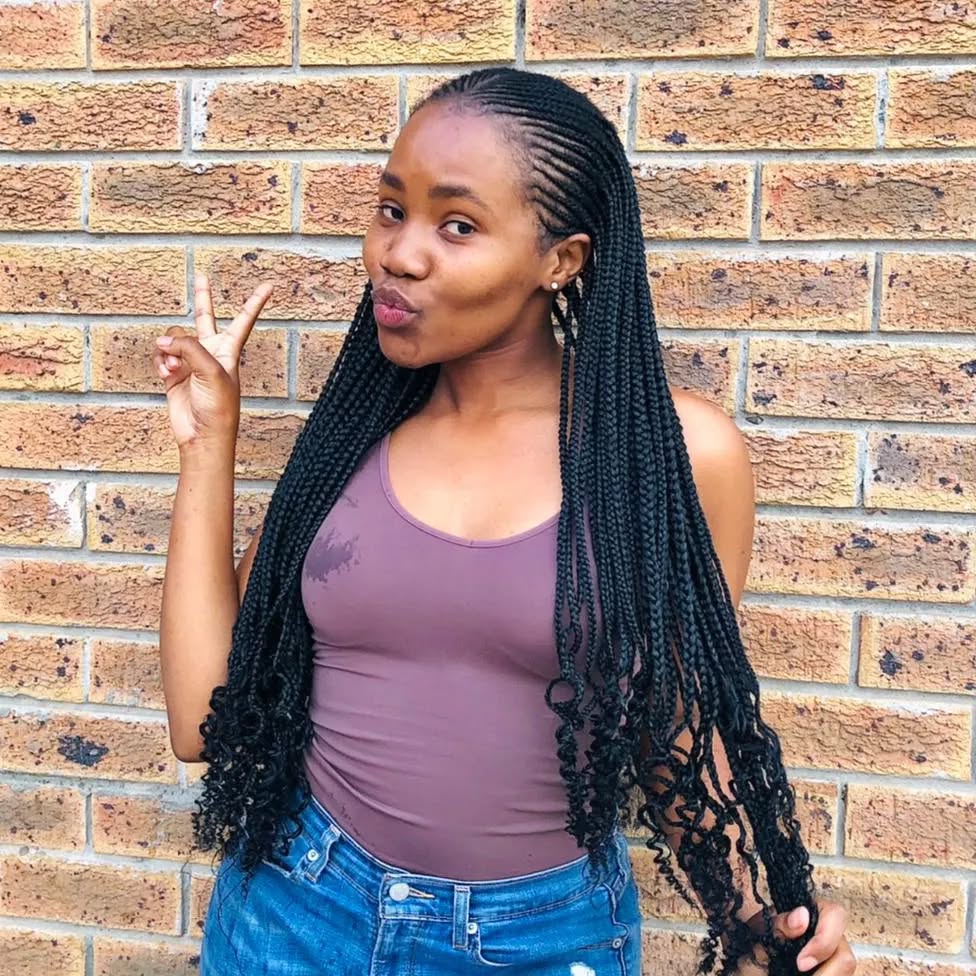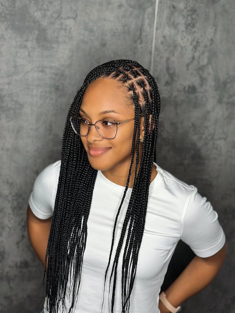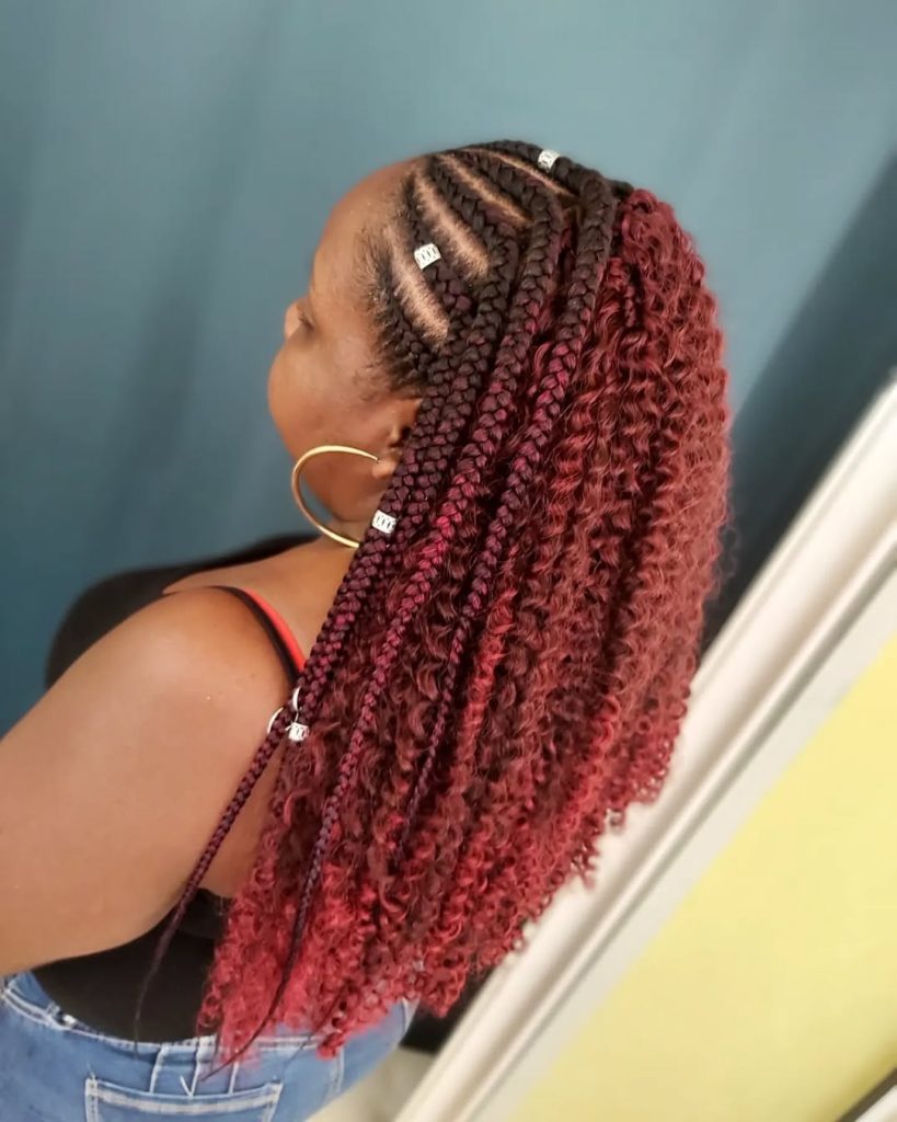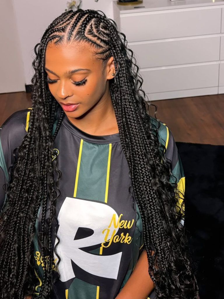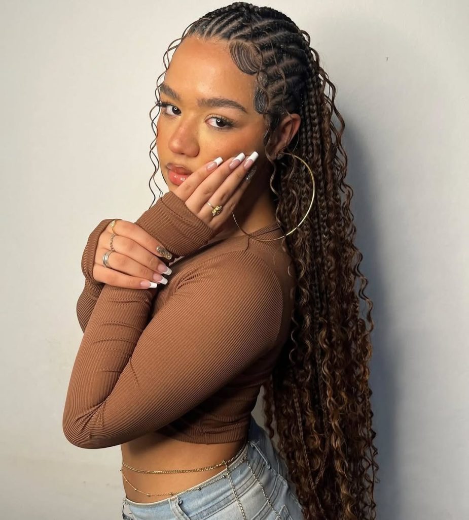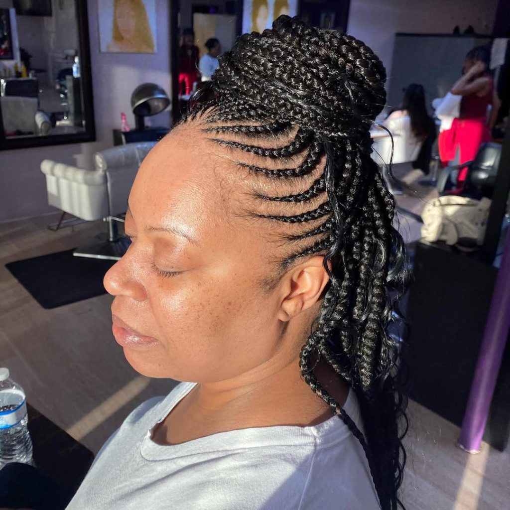 A side part anchors small knotless braids interlaced with free curly strands, creating movement without bulk. The scalp pattern is crisp, the finish silky—ideal for women who want something dressy that’s still simple to maintain on a busy schedule. Team with a varsity tee and glossy lip for off-duty; switch to a blazer and stacked necklaces for instant polish.