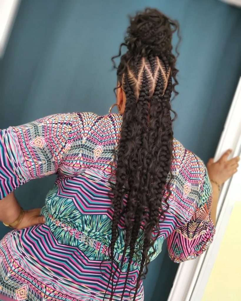Chevron-like cornrows angle toward the crown, where a textured top bun anchors cascading goddess lengths. The split silhouette—structured base, curly ends—delivers movement without sacrificing polish, a favorite for weddings or milestone birthdays.