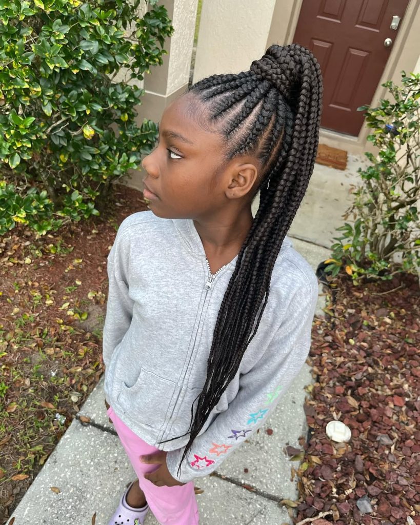 Small, tight feed-ins climb toward a compact topknot, while the remaining lengths fall straight and uniform. The contrast—structured base, free-flowing ends—reads fresh and youthful without skewing kids.