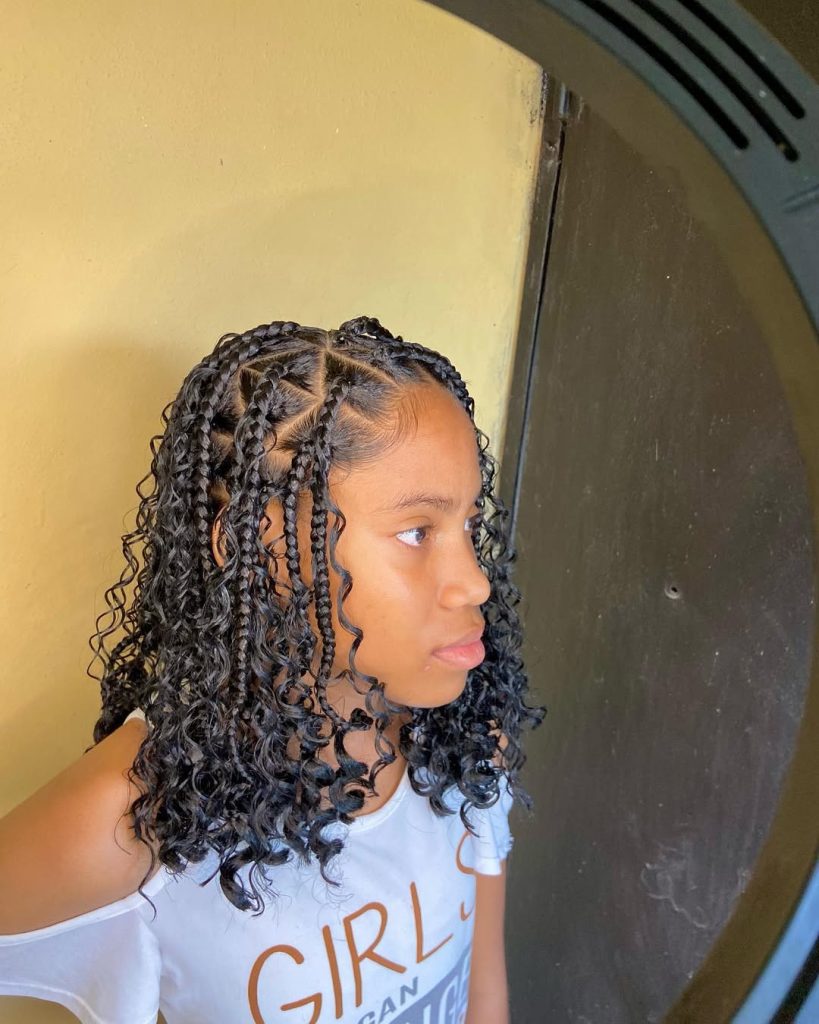 Chunky, square-parted braids end in springy, curly coils for a bouncy, shoulder-grazing bob—playful for kids and chic on petites who favor short lengths. The airy pattern keeps the scalp breathable and the movement lively.
