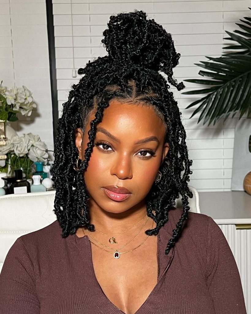 Textured faux locs, cut to the collarbone, are lifted into a casual top bun for a half-up updo that reads cozy and cool. Wispy curly ends punctuate each loc, adding softness around the jawline.