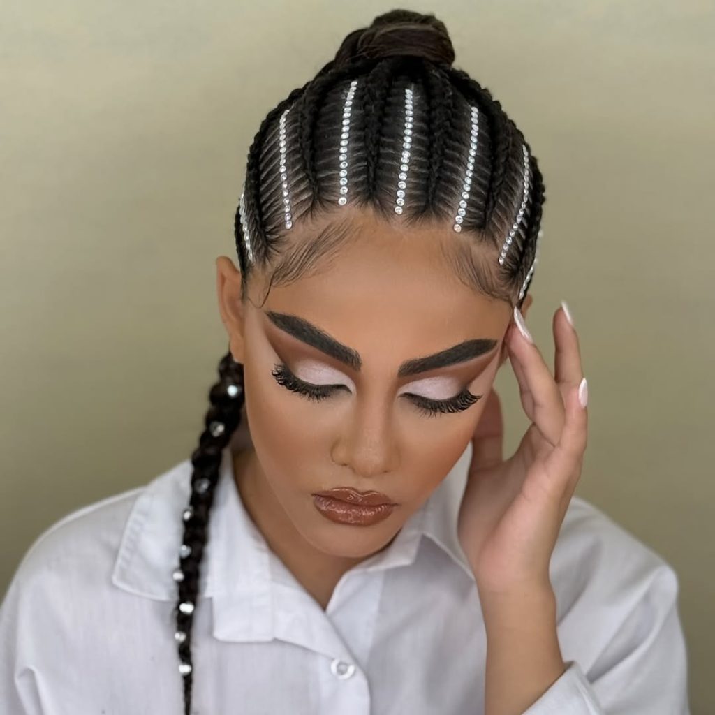 Slim, even feed-ins are accented with rhinestone rows that track each part, then meet in a low pony. Think studio lighting without the studio—tiny crystal pops catch every movement. Keep makeup neutral to let the accents shine, or echo the color with a silver liner. It’s an event-ready updo that still fits under a wool cap on cold mornings.