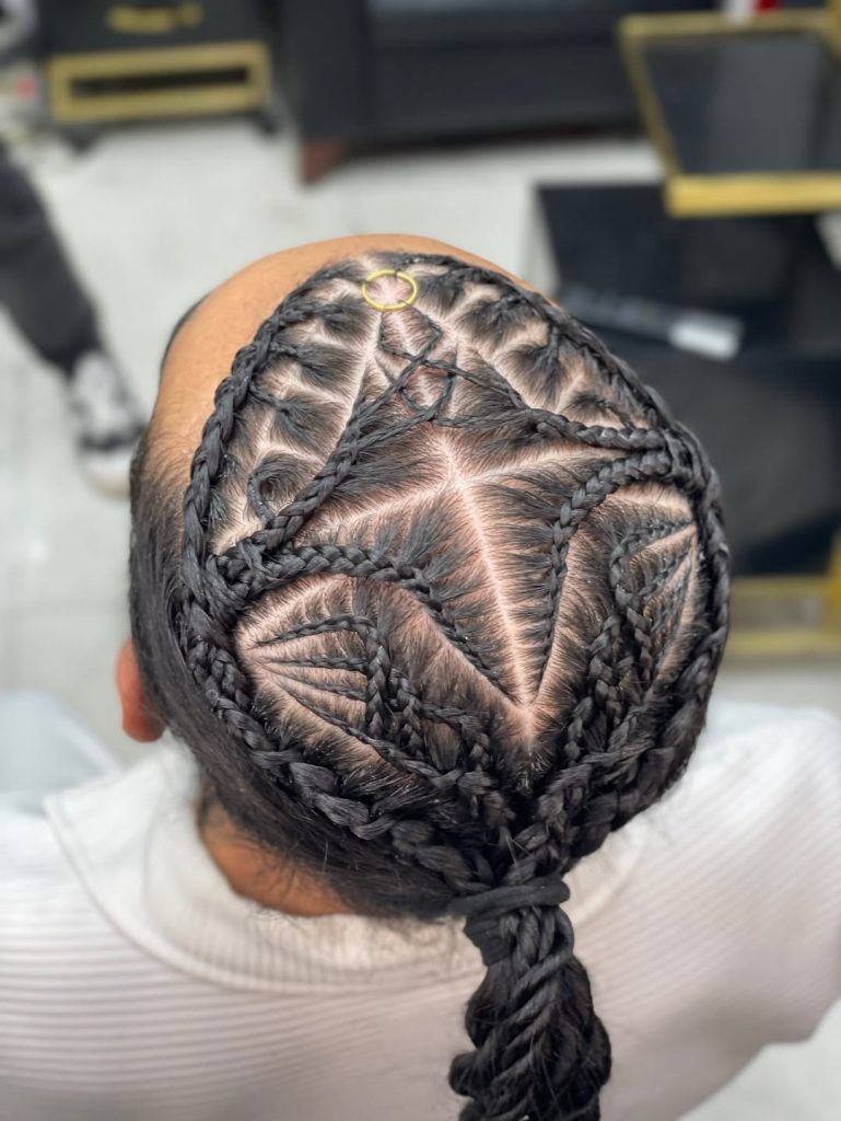 An intricate star at the crown branches into leaf-inspired sections, each stitched with micro-braids that join a neat tail. The geometry is editorial yet wearable—proof that protective styles in 2026 can be true craftsmanship. Ask your stylist for low tension along the edges and a longer install window; a style like this deserves patient parting.