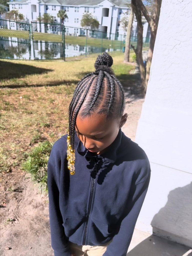 Neat feed-in cornrows angle toward the crown and gather into a compact top bun, while one slender side braid is finished with stacked gold-and-clear beads—a cheerful pop of color that jingles just enough to delight. This school-ready updo keeps strands secure without tension along the hairline, and the light density makes it genuinely easy for morning routines in 2026.
