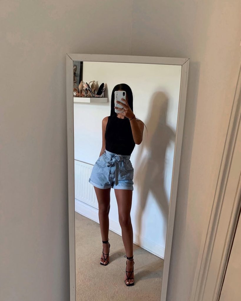 When you pair a fitted black sleeveless tank with light paperbag denim shorts and strappy high heels, you exude the ultimate casual summer confidence.