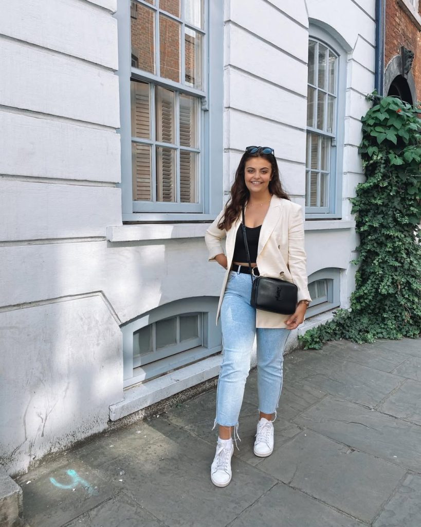 A cream blazer over a black tank and light denim and sneakers provides you with the perfect hit of casual comfort and smart, everyday tailoring.