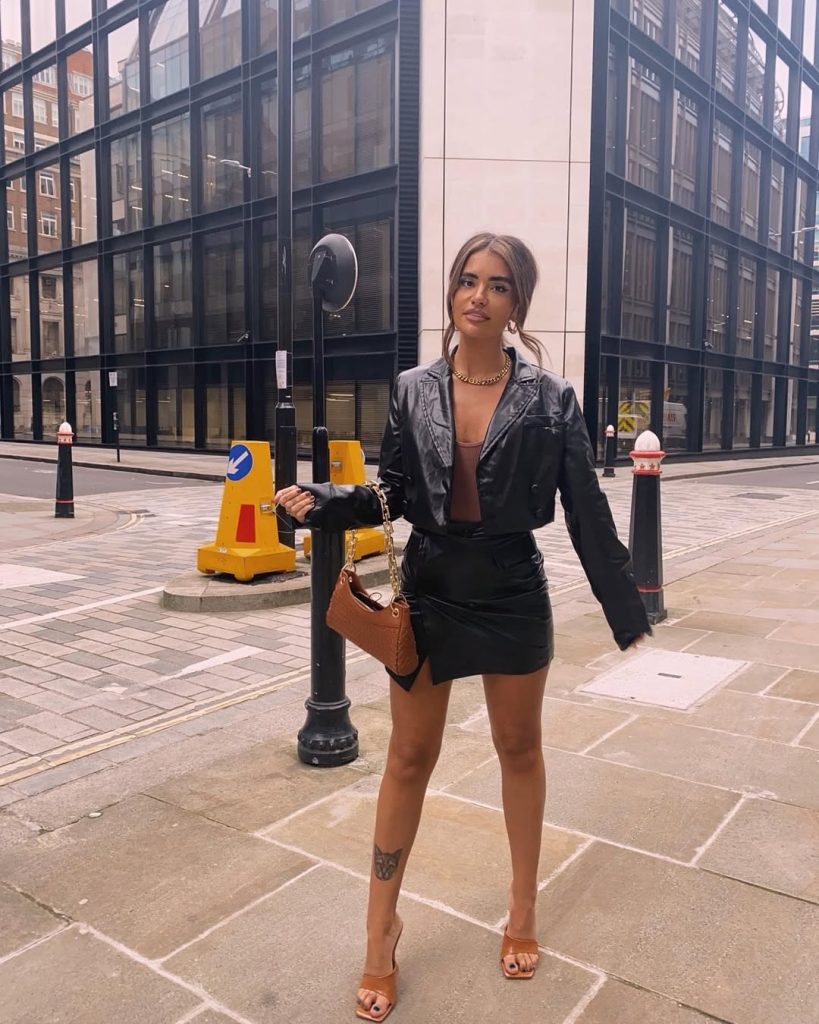 Cropped black leather, a sleek mini skirt, and warm brown accents come together for a sharp, city-ready outfit that’s brunch at noon and cocktails by four.